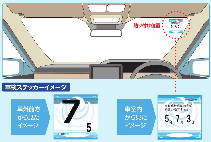 | 車検満期はFガラスのステッカーを確認してください 左上の丸いステッカーは定期点検(12ヵ月点検)です |