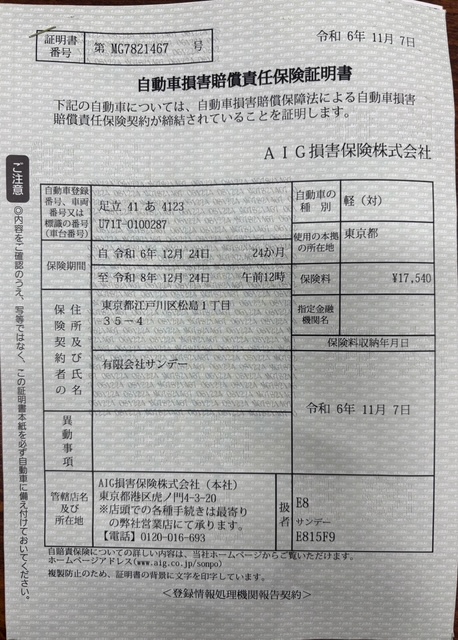 自動車検査証(車検証) | 自動車損害賠償責任保険証明書 (自賠責保険) |